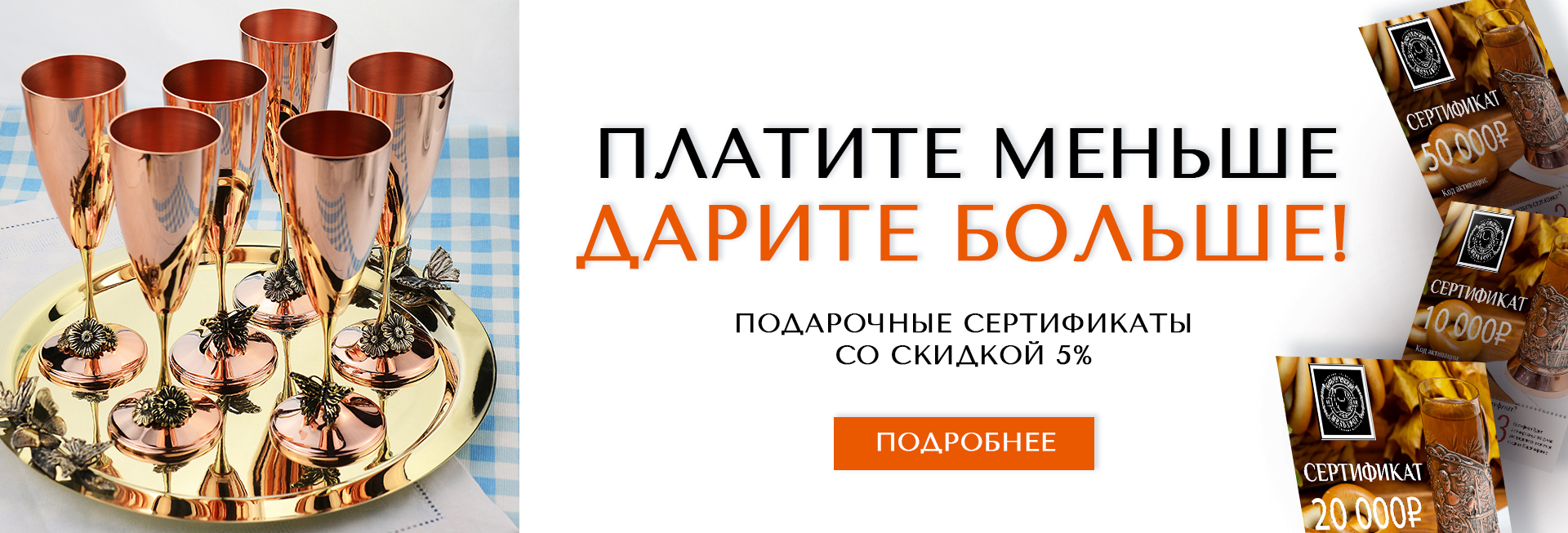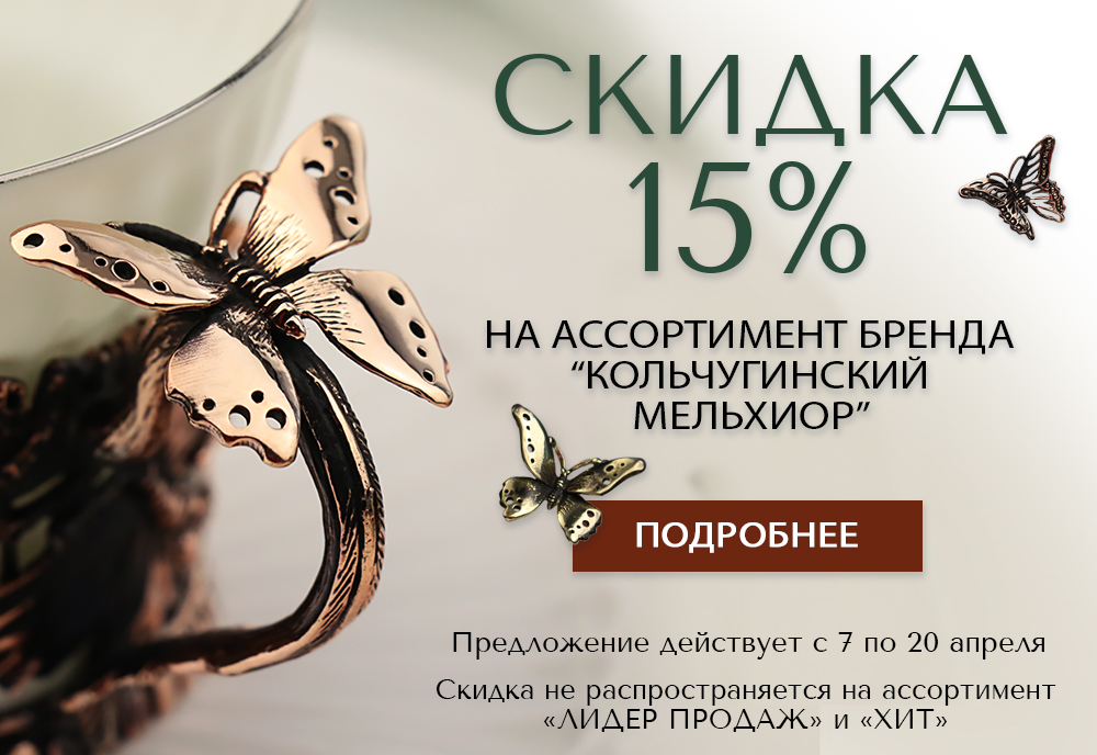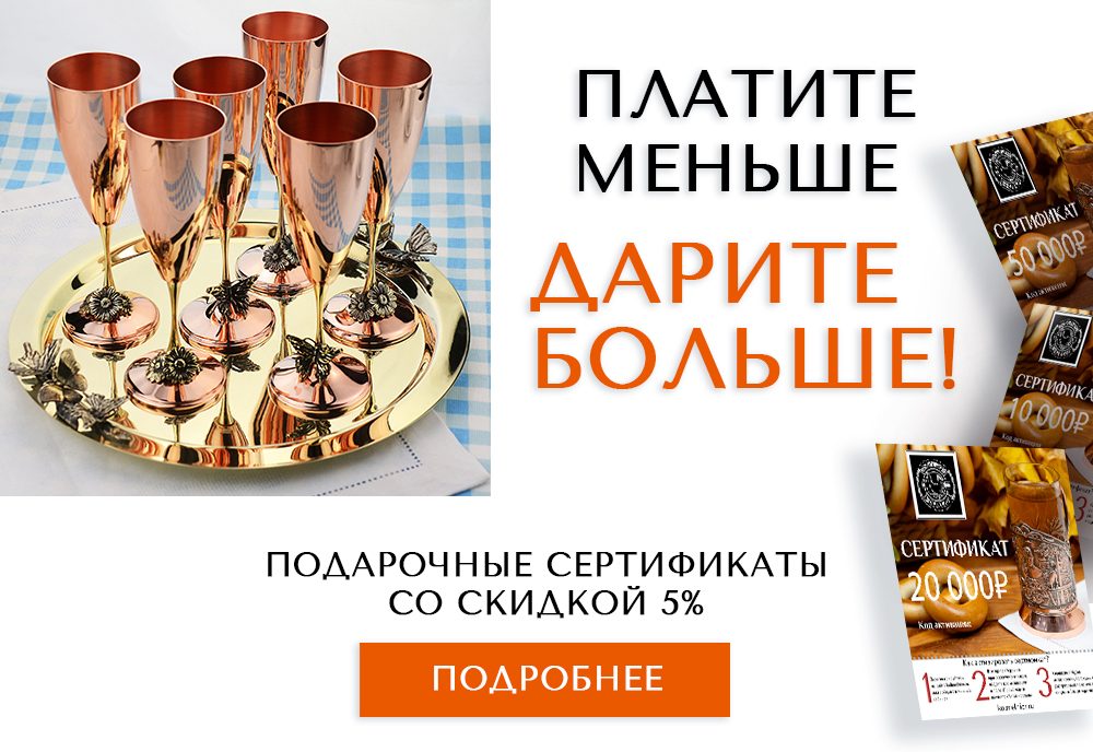 В наших фирменных магазинах во Владимире и Екатеринбурге, а также на официальном сайте можно купить подстаканники (латунные, медные, никелированные, с позолотой), стаканы, столовые приборы, изделия из детской серии DO DO, разнообразную посуду (тазы, подносы, турки, кувшины). В отдельном разделе каждой категории предложены подарочные наборы. Мы собрали интересные композиции из позиций каталога, которые окажутся полезными в доме и станут прекрасным подарком по любому поводу. Красивая посуда и товары домашнего обихода можно считать беспроигрышным универсальным презентом, а если это образцы в такой стилистике, то их ценность повышается в разы. На все изделия из меди, латуни, с серебряным и золотым покрытием имеются сертификаты, а shop.KolMelhior – это официальный магазин ТМ «Кольчугинский мельхиор». Поэтому любую понравившуюся позицию Вы можете заказать без опасений.
